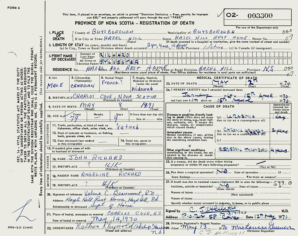 1. PLACE OF DEATH County of Guysborough If in City or Town Hazel Hill