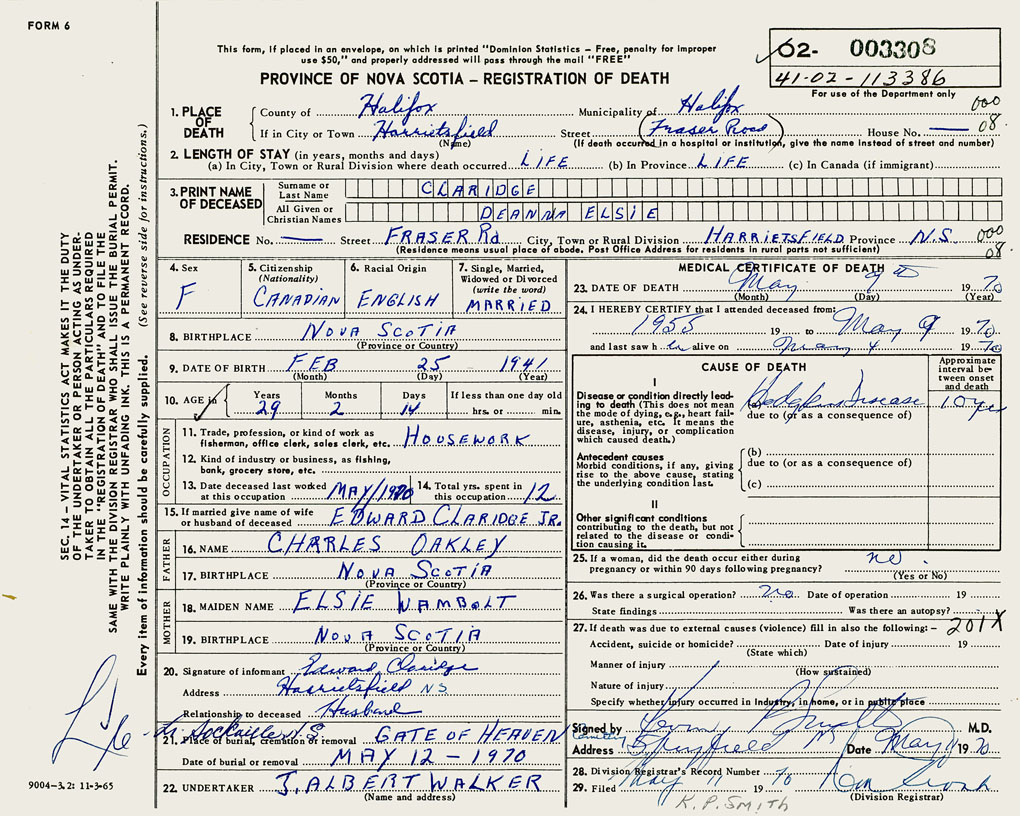 PROVINCE OF NOVA SCOTIA — REGISTRATION OF DEATH