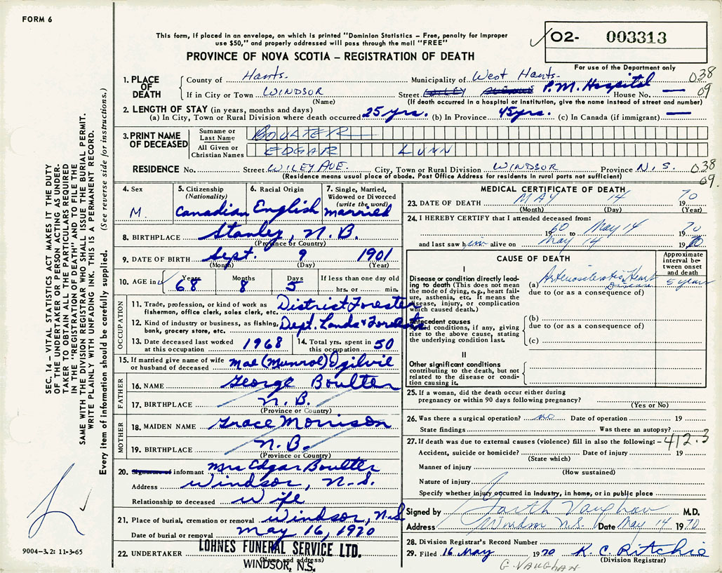 1. PLACE OF DEATH County of Hants If in City or Town Windsor