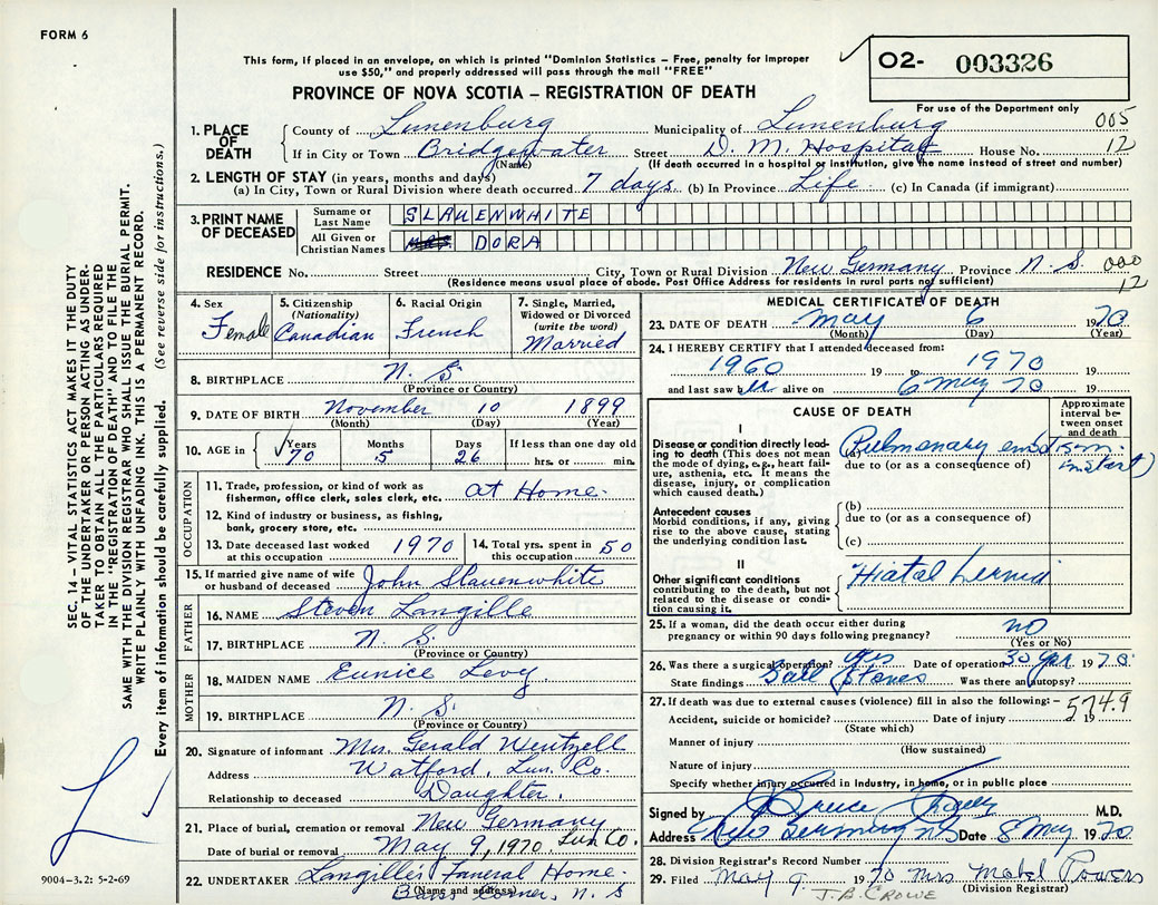 Female Death Registration: Year: 1970 number: 3326