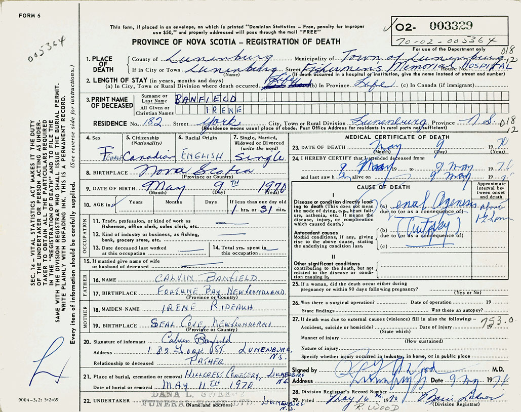 21. Place of burial Hillcrest Cemetery, Lunenburg