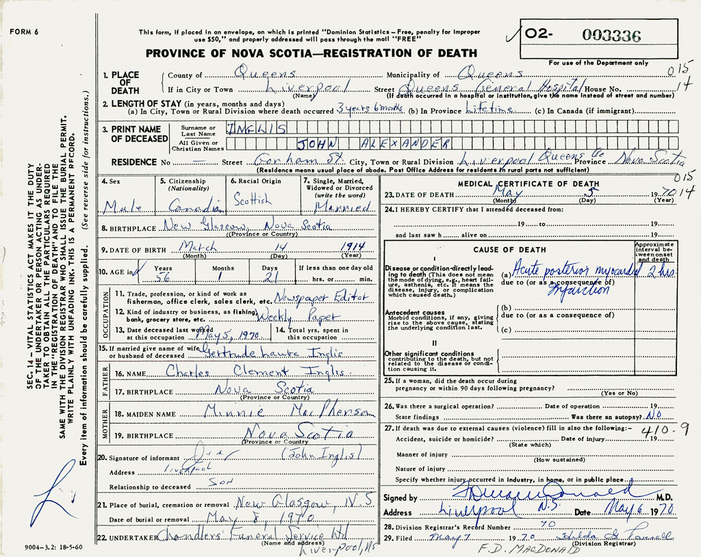 PROVINCE OF NOVA SCOTIA — REGISTRATION OF DEATH