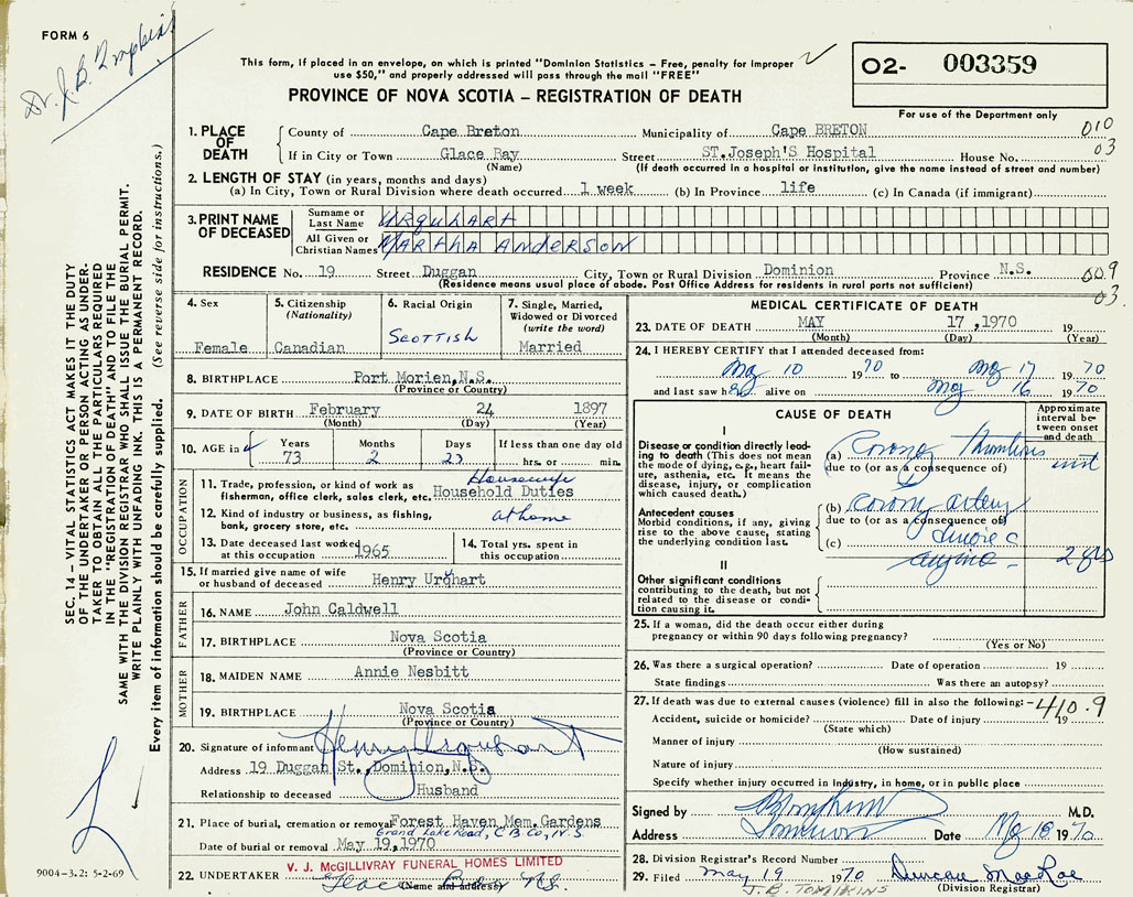 1. PLACE OF DEATH County of Cape Breton If in City or Town Glace Bay