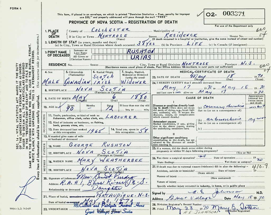 PROVINCE OF NOVA SCOTIA — REGISTRATION OF DEATH