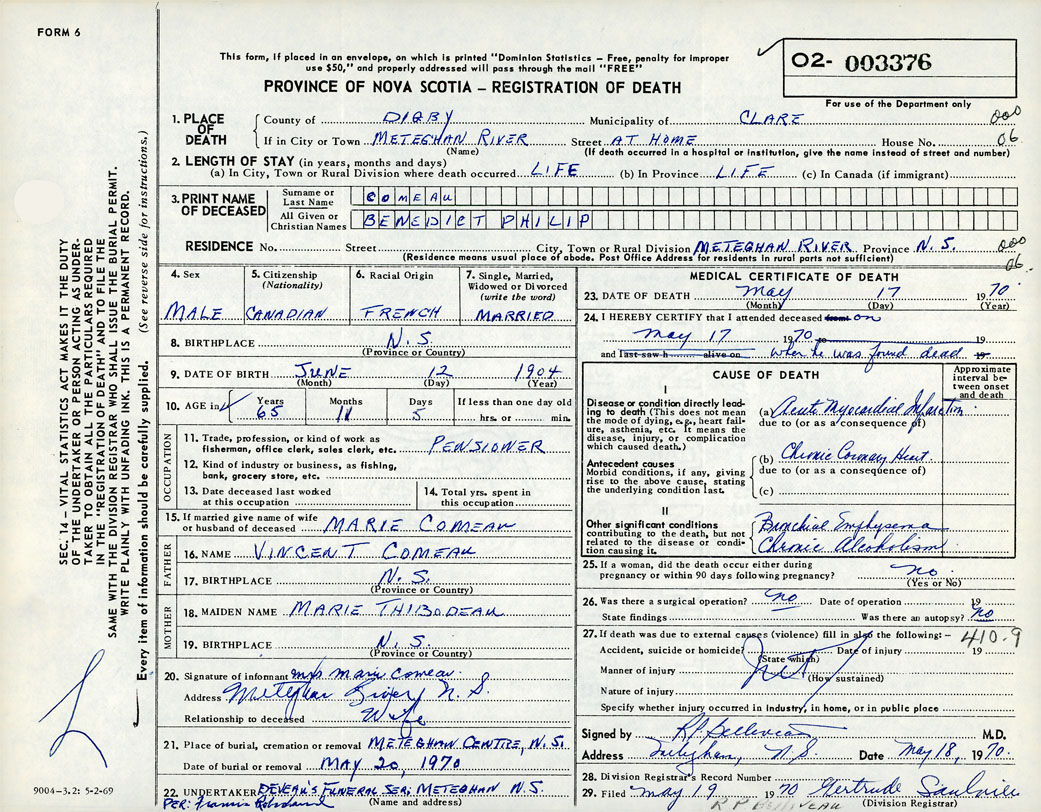 1. PLACE OF DEATH County of Digby If in City or Town Meteghan River