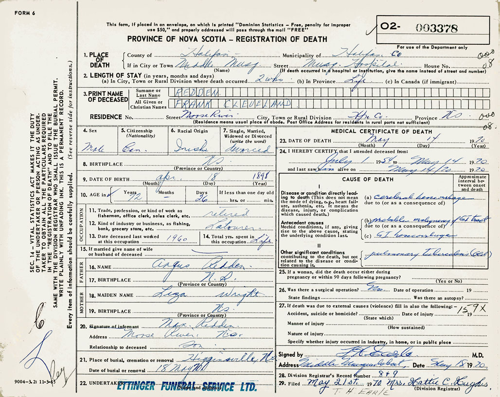 PROVINCE OF NOVA SCOTIA — REGISTRATION OF DEATH