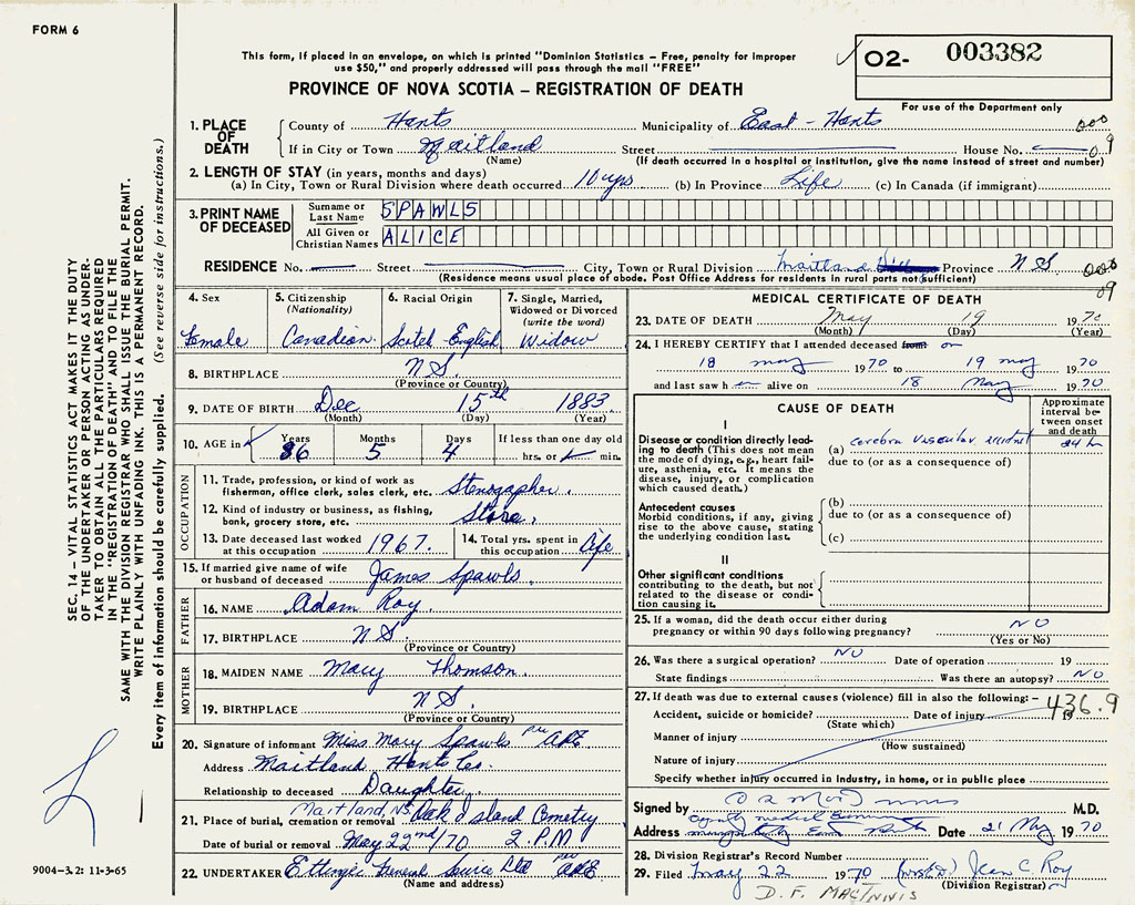 PROVINCE OF NOVA SCOTIA — REGISTRATION OF DEATH