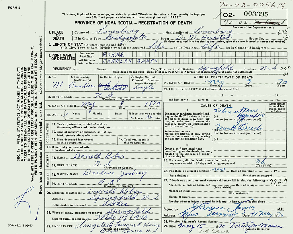 PROVINCE OF NOVA SCOTIA — REGISTRATION OF DEATH
