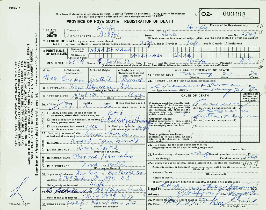 PROVINCE OF NOVA SCOTIA — REGISTRATION OF DEATH