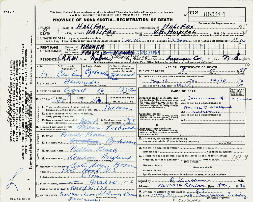 PROVINCE OF NOVA SCOTIA — REGISTRATION OF DEATH