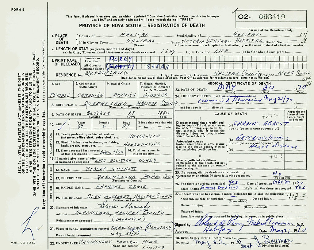 PROVINCE OF NOVA SCOTIA — REGISTRATION OF DEATH
