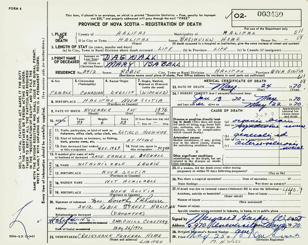 PROVINCE OF NOVA SCOTIA — REGISTRATION OF DEATH