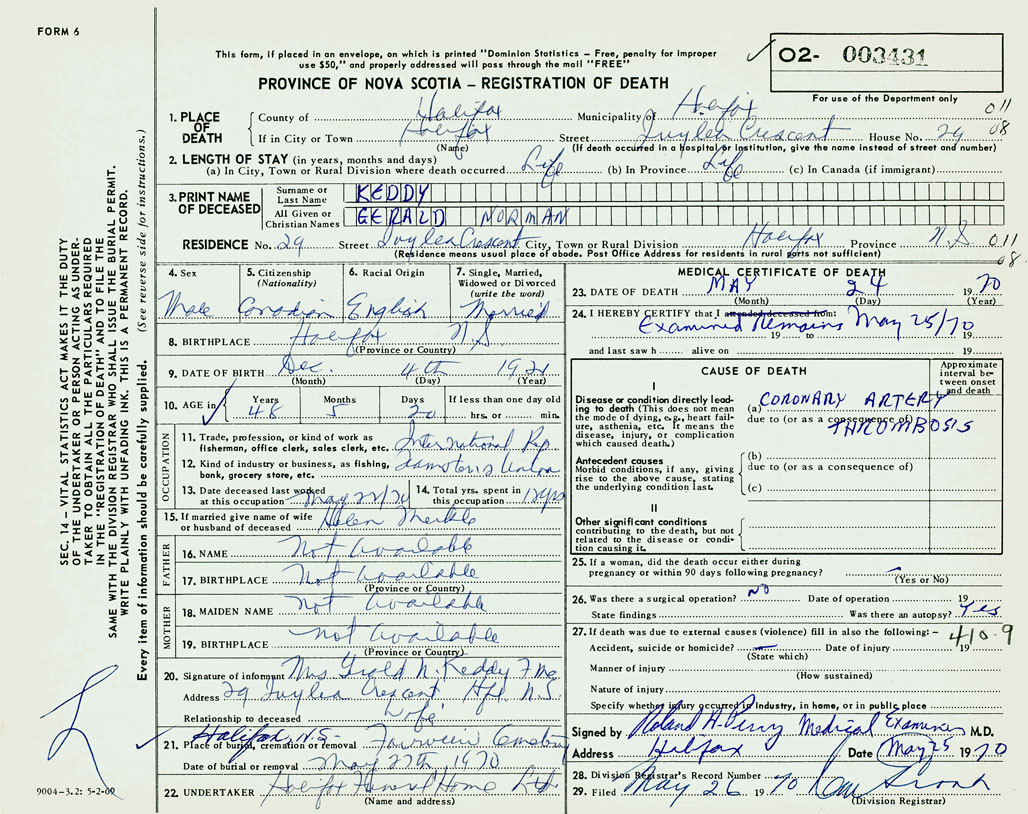 PROVINCE OF NOVA SCOTIA — REGISTRATION OF DEATH