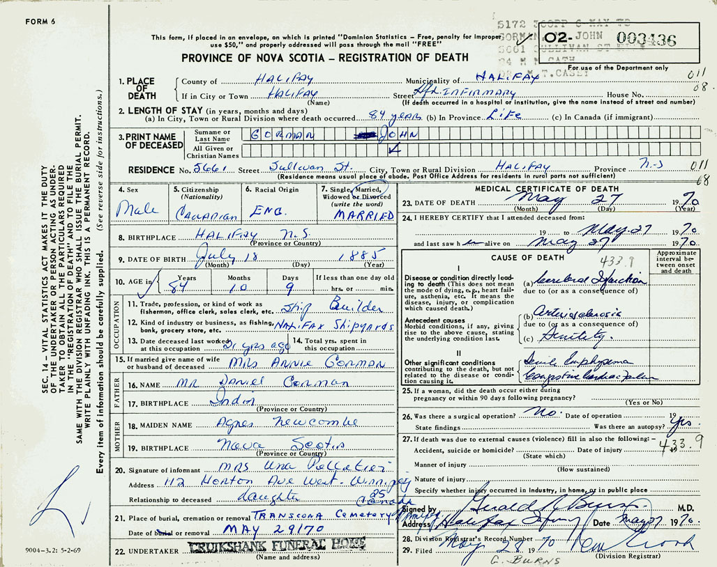 PROVINCE OF NOVA SCOTIA — REGISTRATION OF DEATH