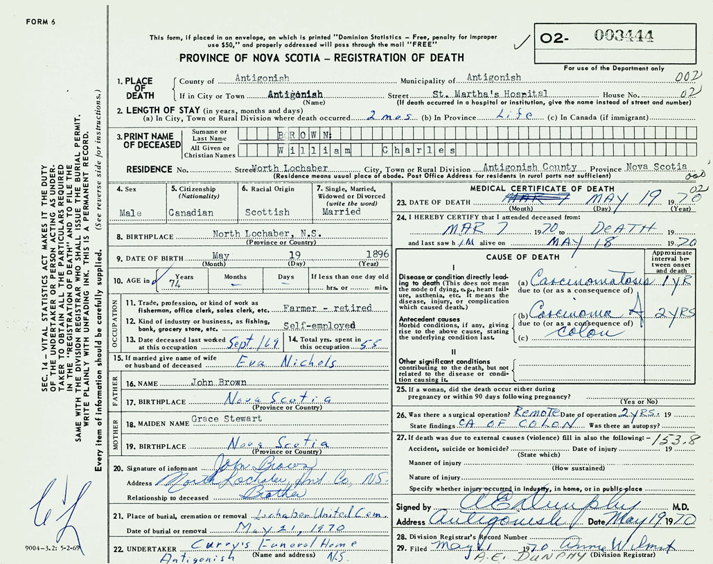 PROVINCE OF NOVA SCOTIA — REGISTRATION OF DEATH