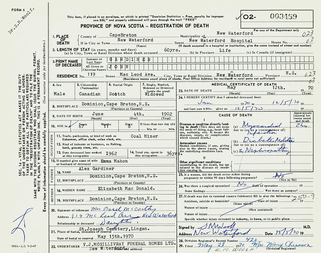1. PLACE OF DEATH County of Cape Breton If in City or Town New Waterford