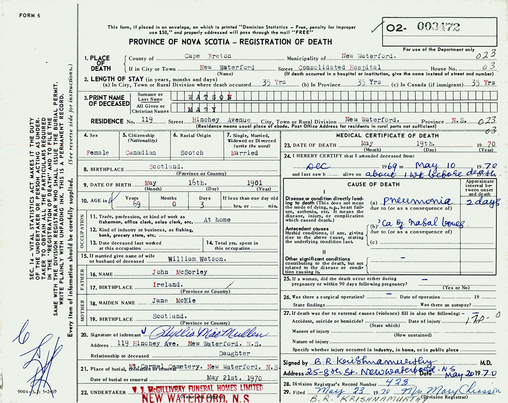 1. PLACE OF DEATH County of Cape Breton If in City or Town New Waterford