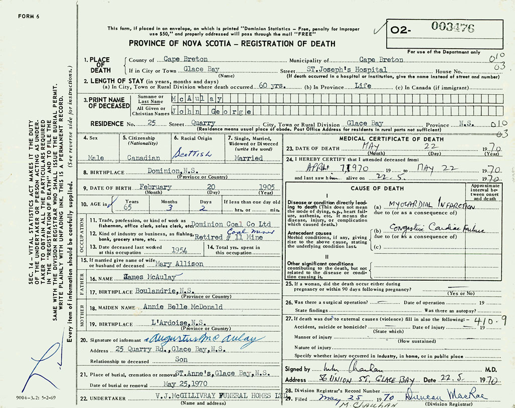 1. PLACE OF DEATH County of Cape Breton If in City or Town Glace Bay