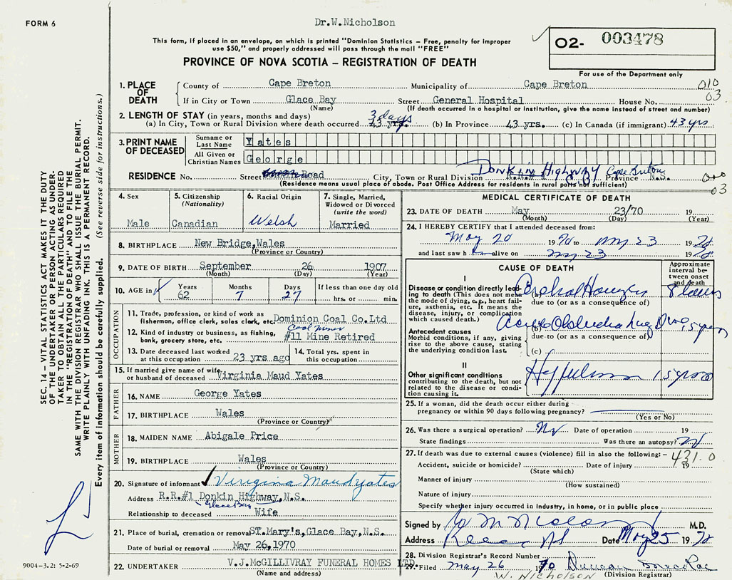 1. PLACE OF DEATH County of Cape Breton If in City or Town Glace Bay