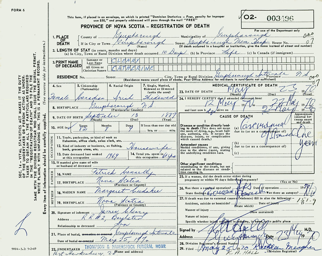1. PLACE OF DEATH County of Guysborough If in City or Town Guysborough