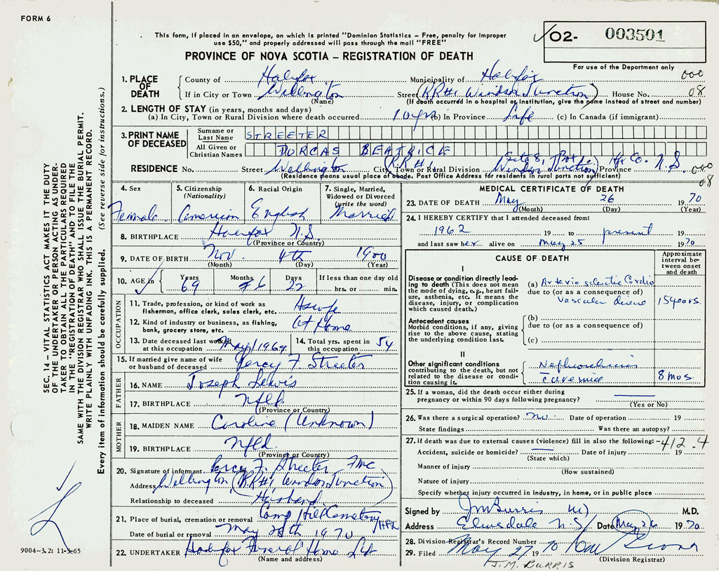 PROVINCE OF NOVA SCOTIA — REGISTRATION OF DEATH
