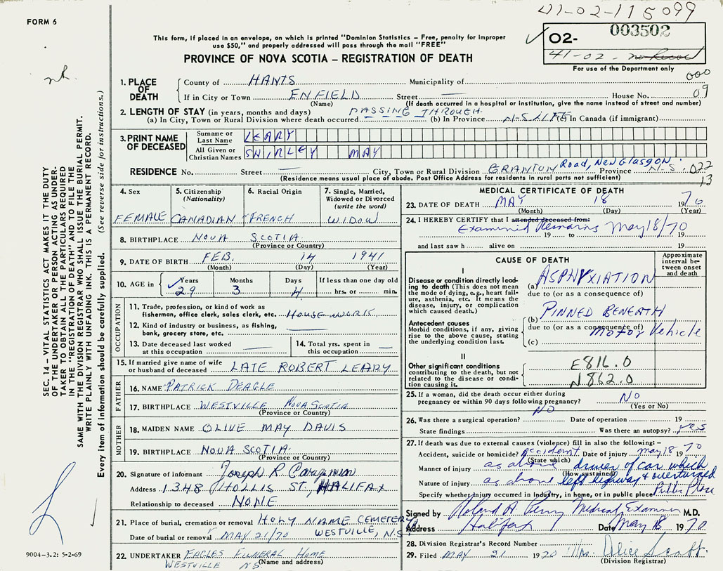 PROVINCE OF NOVA SCOTIA — REGISTRATION OF DEATH