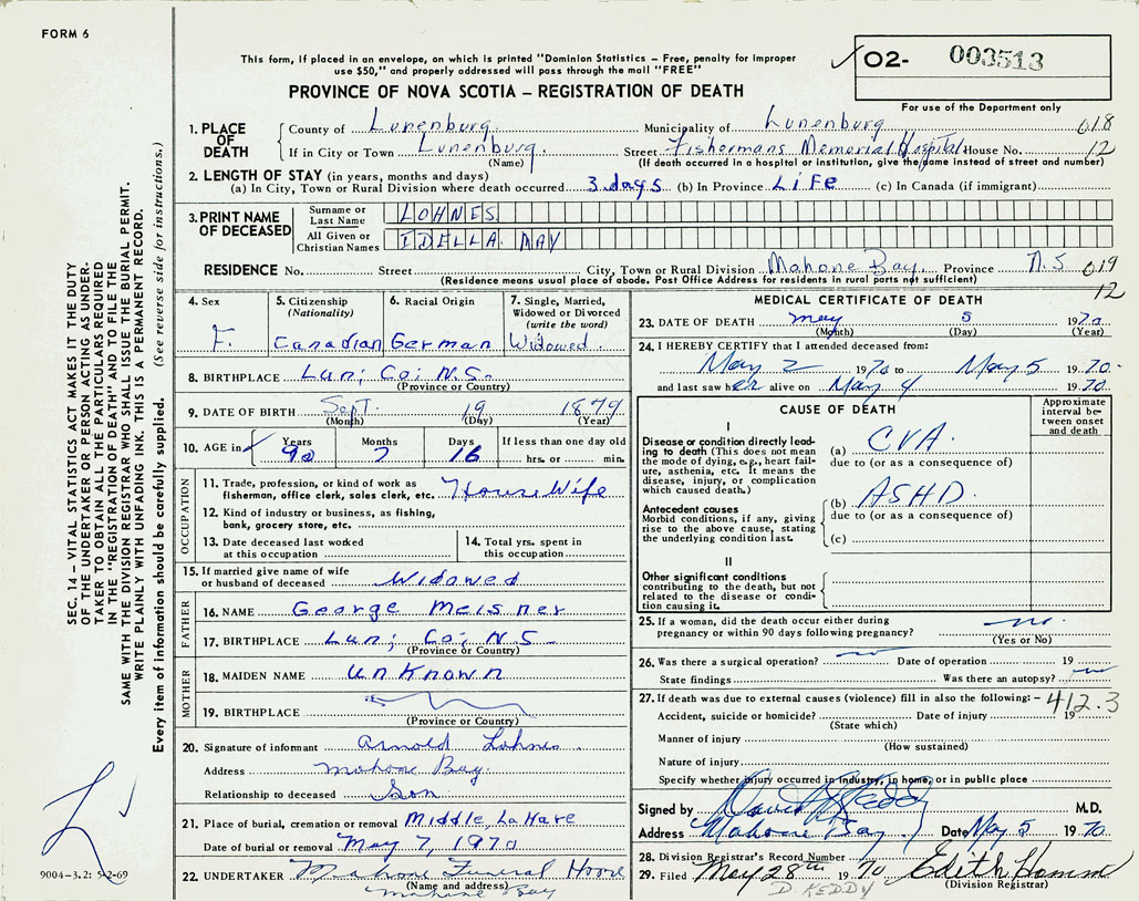 If death occured in a hospital or institution Fishermans Memorial Hospital, Lunenburg