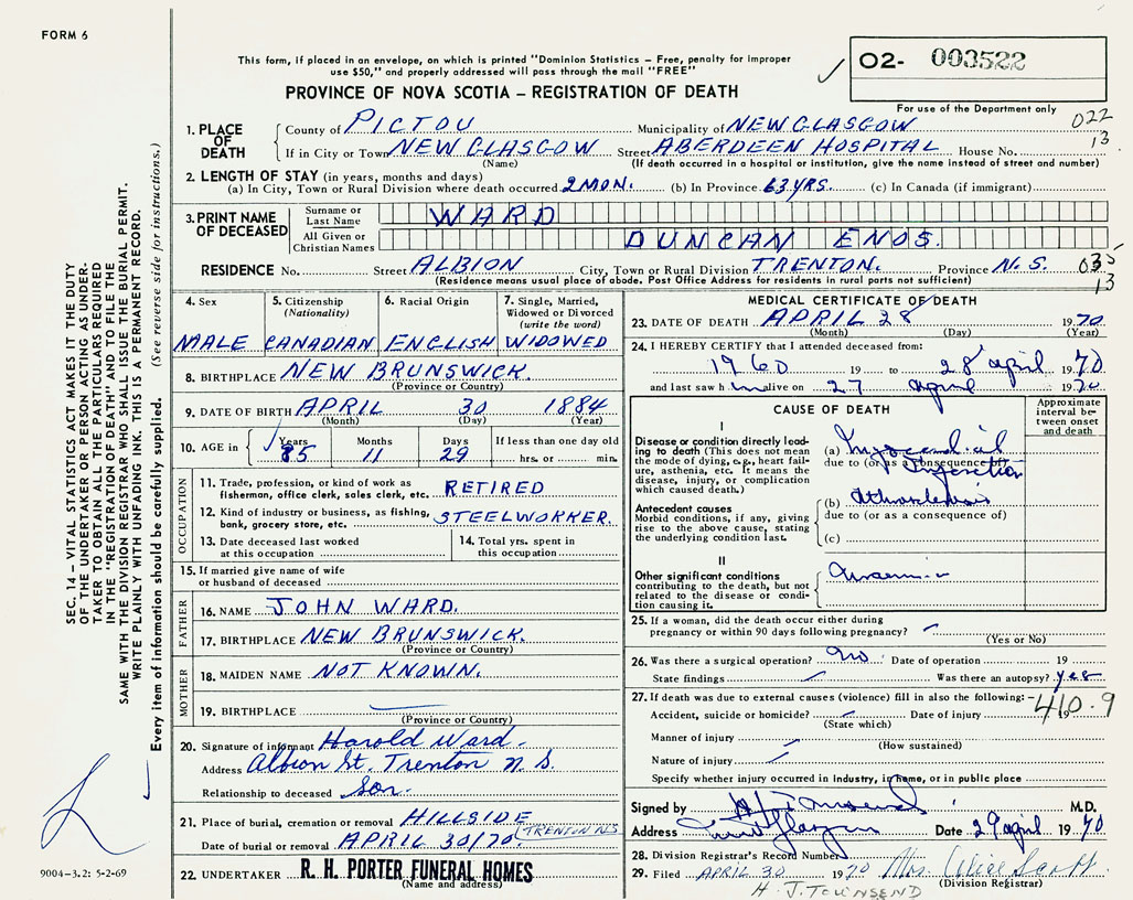PROVINCE OF NOVA SCOTIA — REGISTRATION OF DEATH