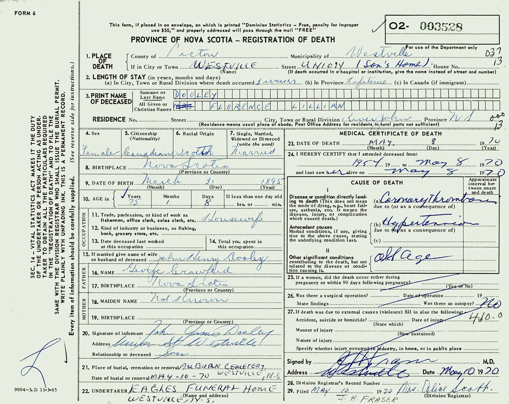 PROVINCE OF NOVA SCOTIA — REGISTRATION OF DEATH