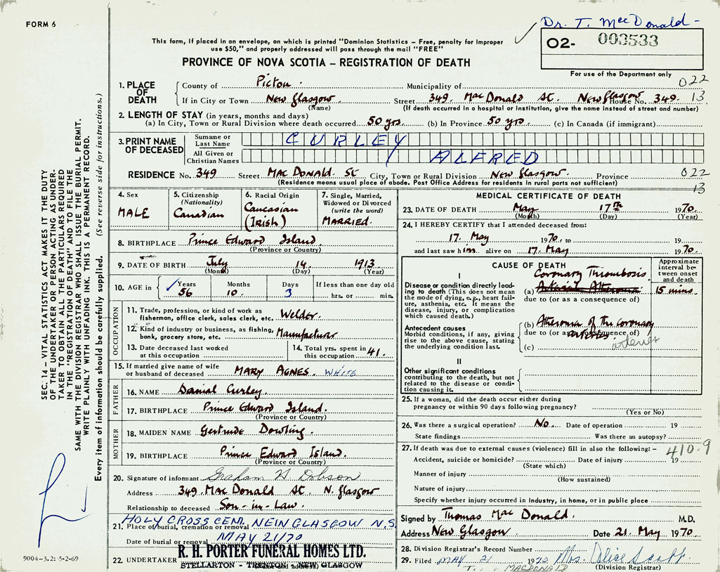 If death occured in a hospital or institution 349 MacDonald St., New Glasgow