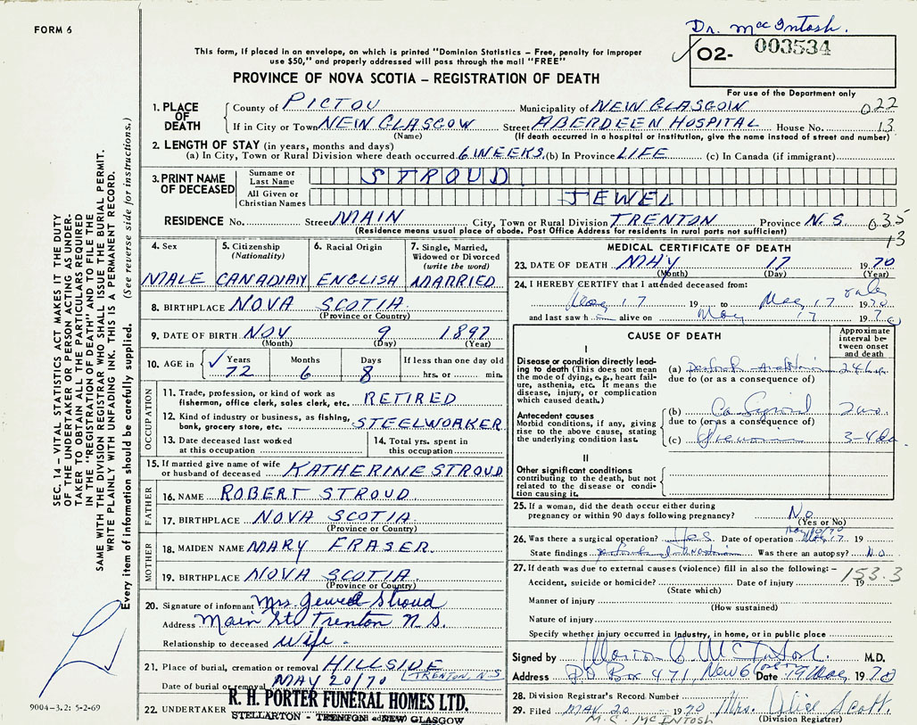 1. PLACE OF DEATH County of Pictou If in City or Town New Glasgow