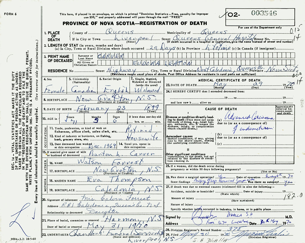PROVINCE OF NOVA SCOTIA — REGISTRATION OF DEATH