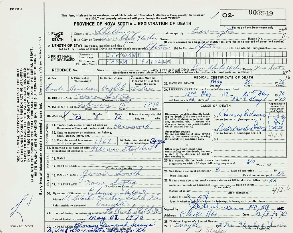 1. PLACE OF DEATH County of Shelburne If in City or Town Lower Clarks Harbour