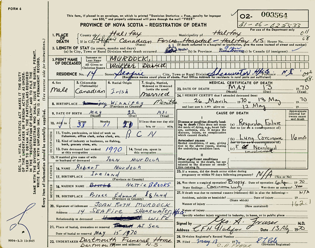 PROVINCE OF NOVA SCOTIA — REGISTRATION OF DEATH