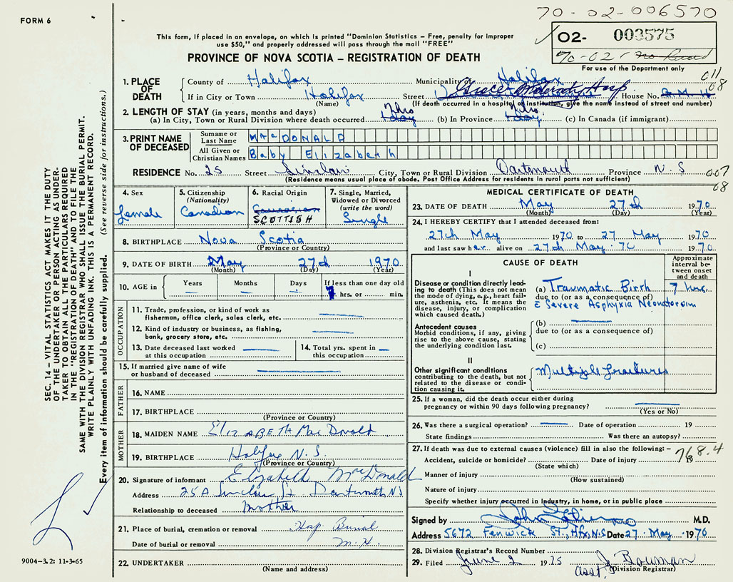 PROVINCE OF NOVA SCOTIA — REGISTRATION OF DEATH