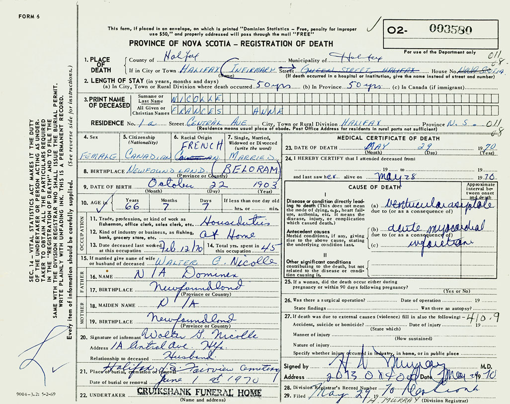 PROVINCE OF NOVA SCOTIA — REGISTRATION OF DEATH