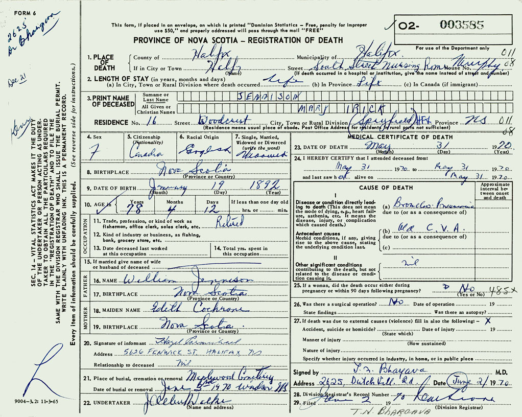 PROVINCE OF NOVA SCOTIA — REGISTRATION OF DEATH