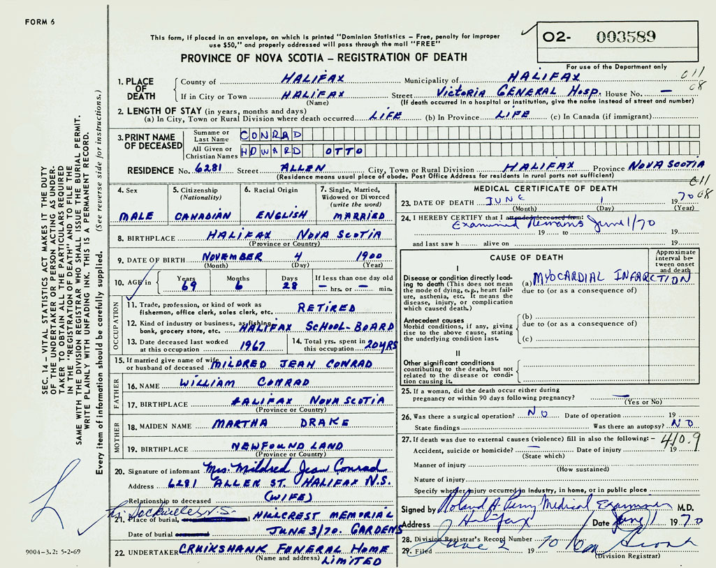 PROVINCE OF NOVA SCOTIA — REGISTRATION OF DEATH
