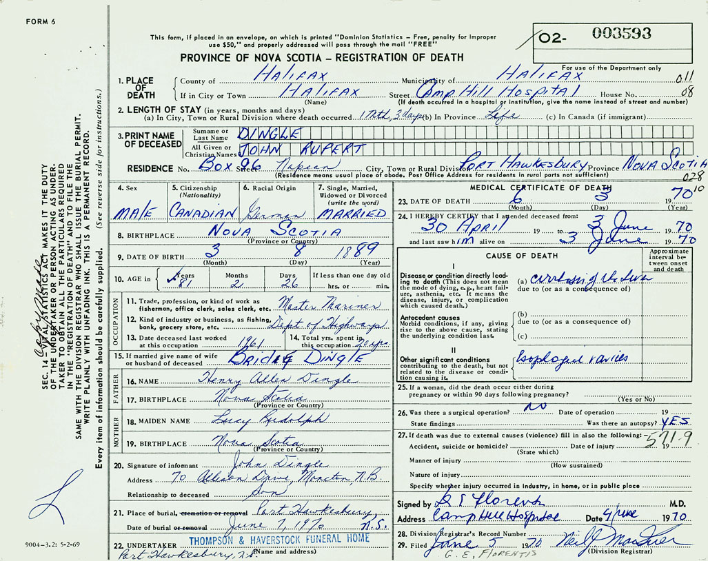 PROVINCE OF NOVA SCOTIA — REGISTRATION OF DEATH