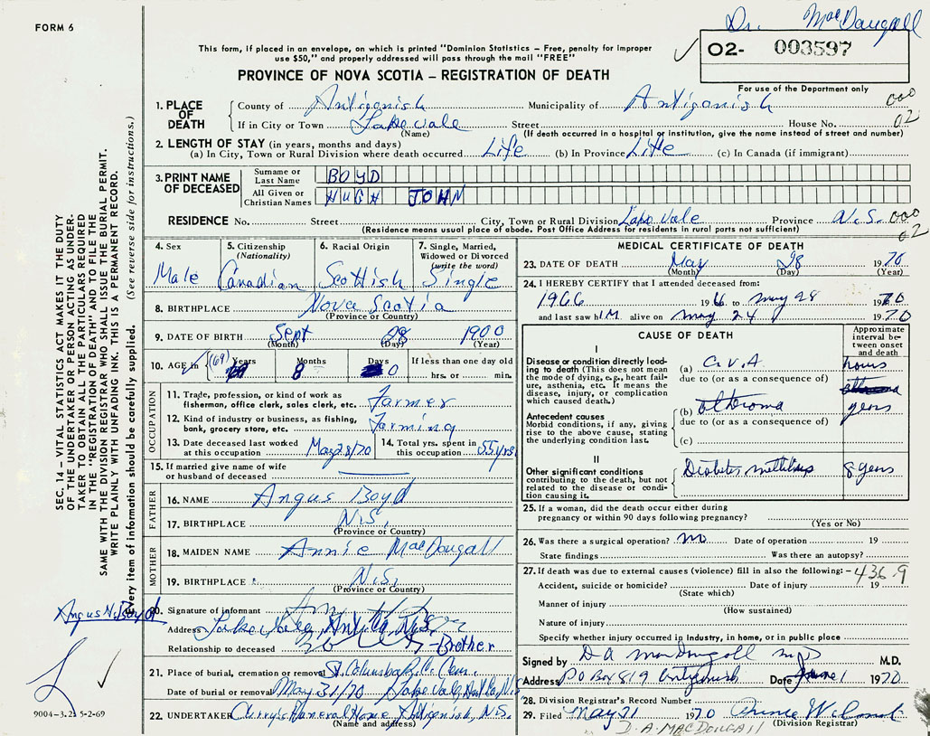PROVINCE OF NOVA SCOTIA — REGISTRATION OF DEATH