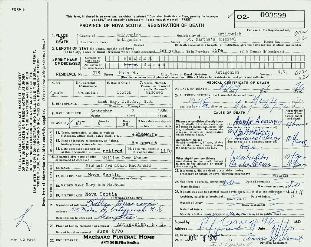 1. PLACE OF DEATH County of Antigonish If in City or Town Antigonish