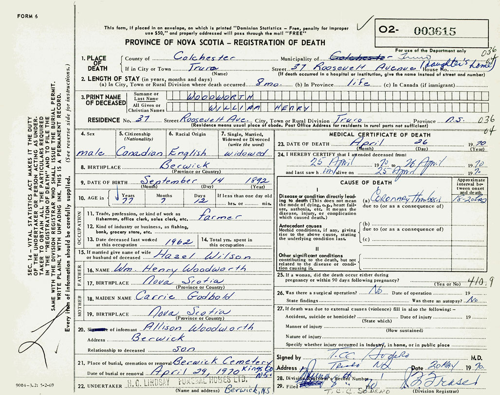 PROVINCE OF NOVA SCOTIA — REGISTRATION OF DEATH