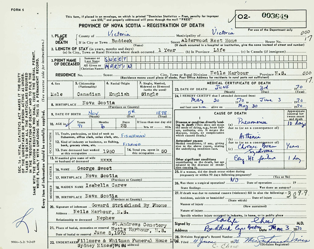 1. PLACE OF DEATH County of Victoria If in City or Town Baddeck
