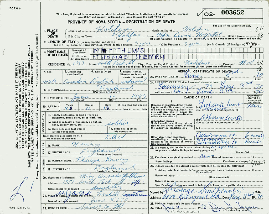 PROVINCE OF NOVA SCOTIA — REGISTRATION OF DEATH