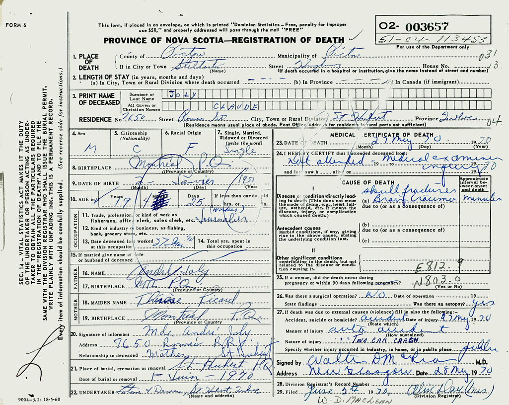 PROVINCE OF NOVA SCOTIA — REGISTRATION OF DEATH