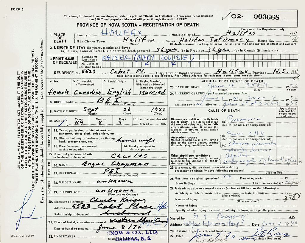 PROVINCE OF NOVA SCOTIA — REGISTRATION OF DEATH