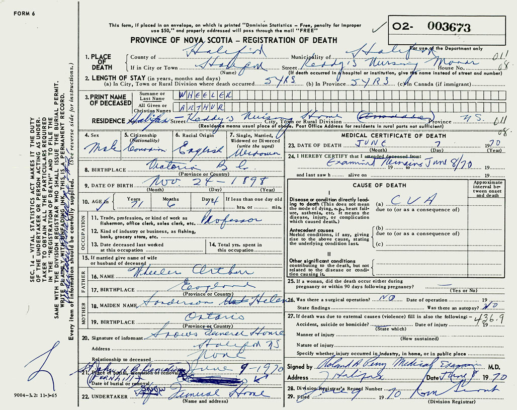 PROVINCE OF NOVA SCOTIA — REGISTRATION OF DEATH