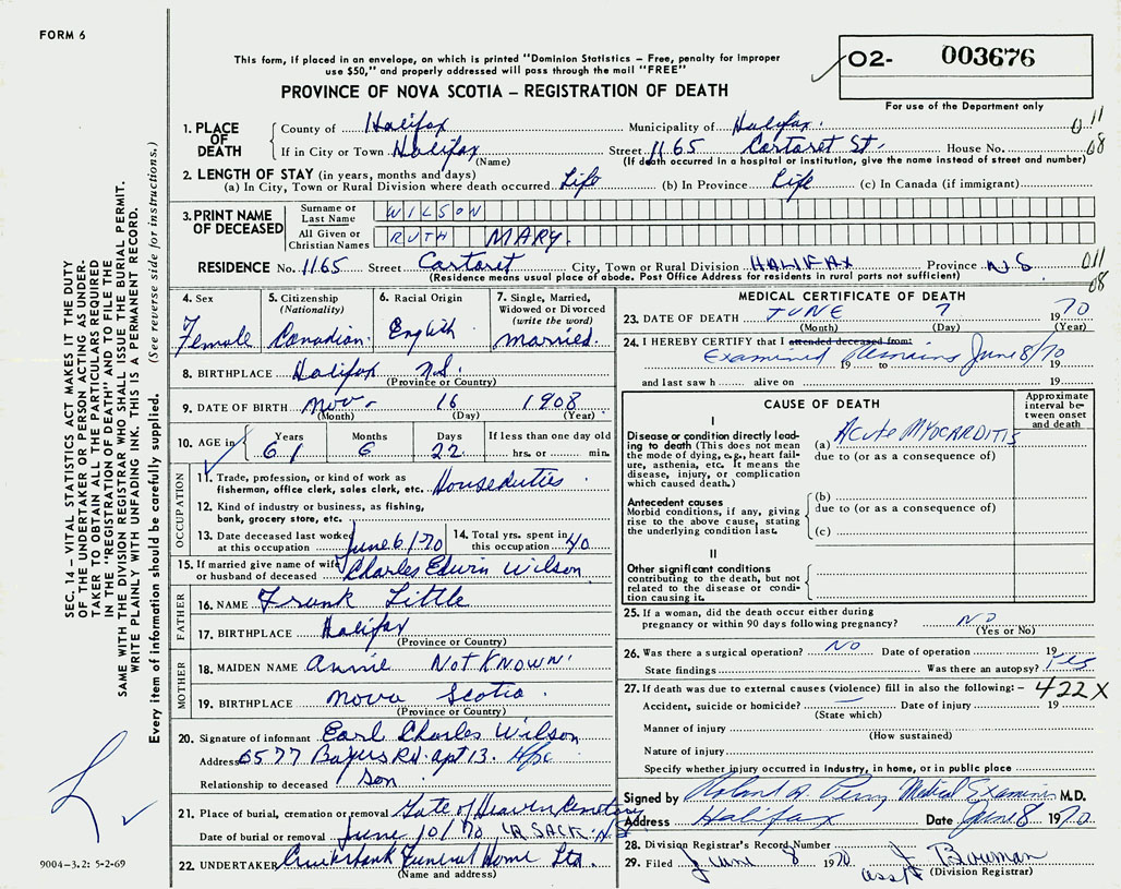 PROVINCE OF NOVA SCOTIA — REGISTRATION OF DEATH