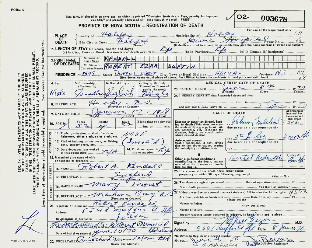 PROVINCE OF NOVA SCOTIA — REGISTRATION OF DEATH