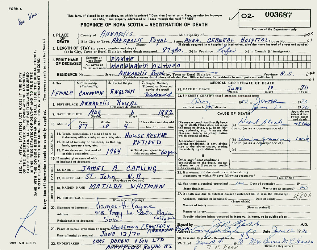 PROVINCE OF NOVA SCOTIA — REGISTRATION OF DEATH